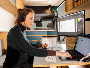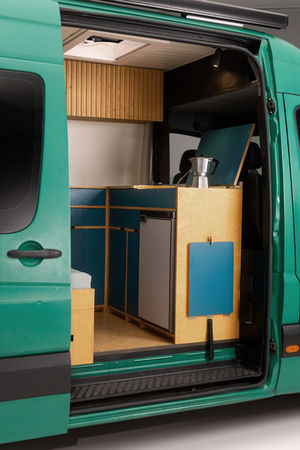 Angela, grafisch ontwerper en fotografe, wilde een camper voor fotoshoots en werksessies in de natuur. Deze camper is zeer ruimtelijk ingericht met een uitschuifbare bedbank dat ongebruikelijk is voor een grotere camper. Juist door dit ontwerp kan ze met twee personen in de camper werken aan twee grote werkbureau's. Er zit zelfs een vast extern beeldscherm in. Ondanks de ruimtelijkheid is er erg veel bergruimte. Samen met haar partner en zoon combineert ze werk en ontspanning, terwijl ze geniet van het buitenleven!